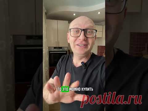 На изображении мужчина в очках и черной футболке находится на кухне. Он улыбается и смотрит в камеру, делая жест рукой, словно объясняя что-то зрителю. На заднем плане можно увидеть современную кухню со светлыми деревянными шкафами, встраиваемую черную духовку и потолок с круглым светильником. Обстановка выглядит уютно и современно, создавая атмосферу домашнего комфорта. На изображении также присутствует вставка текста: "то это можно купить" зелеными и белыми буквами. Далее внизу справа логотип "postila.ru".