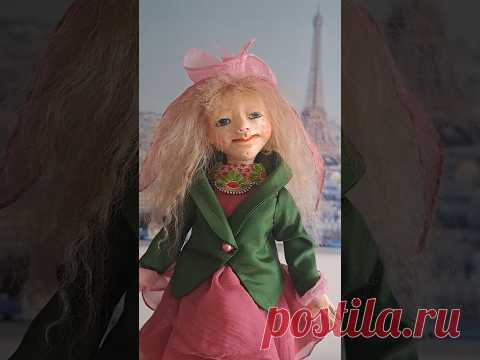 На изображении мы видим куклу с длинными светлыми волосами, убранными розовой лентой, создающей атмосферу нежности и романтики. Она одета в зеленое пальто, которое гармонично сочетается с розовым платьем. Рыжие круглые щеки и тонкая улыбка придают кукле очаровательный вид. На фоне можно заметить размытое изображение Эйфелевой башни, что добавляет парижский шарм. Элемент нежности и изысканности подчеркнут деталями одежды и украшениями, включая декоративные элементы на воротнике пальто. Под платьем видны розовые рукава, создавая эффект многослойности и утонченности. Освещение подчеркивает текстуру тканей, добавляя изображению глубину.