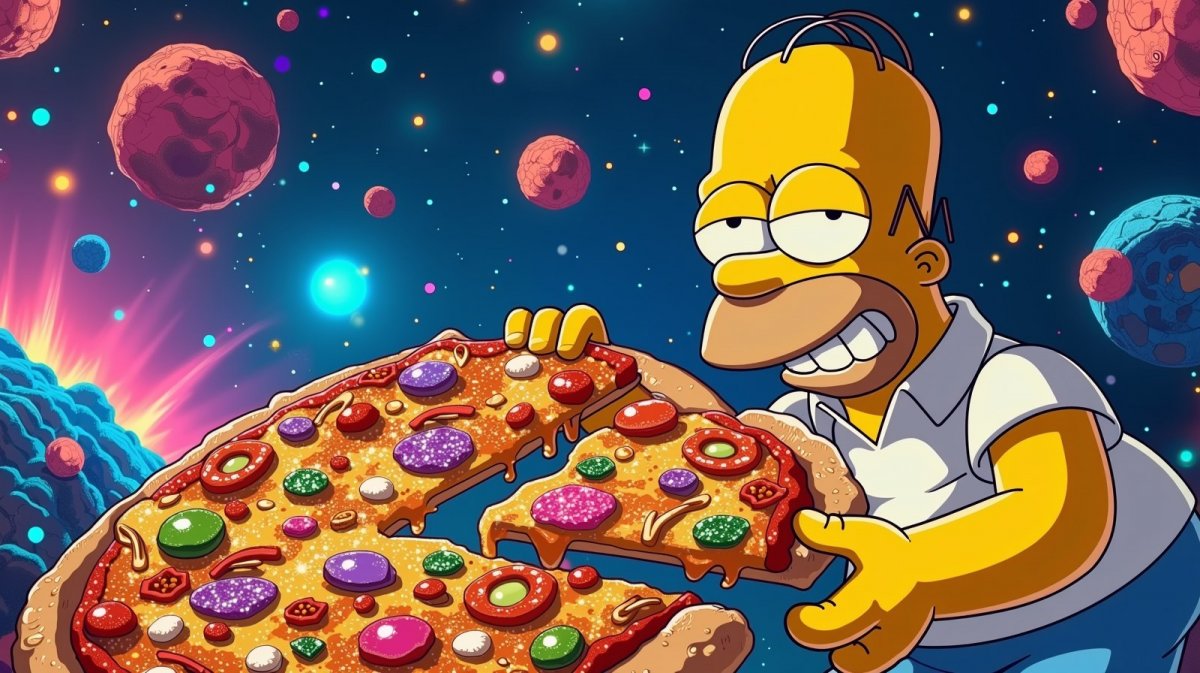 На изображении изображён Гомер Симпсон, персонаж из известного мультсериала. Он держит огромную пиццу с разноцветными топпингами в космической обстановке. Фон заполнен яркими планетами и звездами на тёмном фоне. Гомер выглядит довольным, с широкой улыбкой на лице. Пицца украшена разнообразными ингредиентами, напоминающими драгоценные камни, что делает её особенно привлекательной. Это оформление подчеркивает фантастический и юмористический стиль сцены.