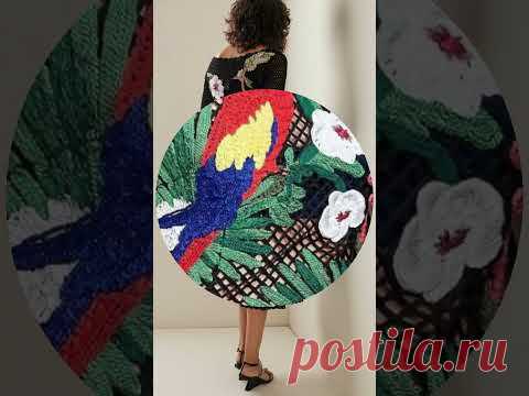 На изображении показана женщина, стоящая в комнате с кремовыми стенами. Она одета в уникальное вязаное платье черного цвета с ярким красочным орнаментом. На платье изображен большой попугай в красных, синих и желтых тонах, окруженный зелеными листьями и белыми цветами. Используется сложная техника вязания, создающая текстуру и объём. На ногах женщины черные сандали на платформе. Атмосфера фотографии подчёркивает яркость и творческий подход в вязании, демонстрируя идею современного авангардного стиля. Фоном служит чистая поверхность, что акцентирует внимание на платье и его деталях.