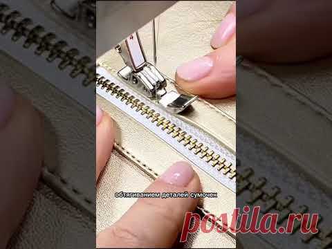 На изображении крупным планом показан процесс сшивания молнии с деталей. Видно, как чьи-то руки аккуратно направляют материал под лапку швейной машины. Лапка машины плотно прижимает ткань, поддерживая ровность шва. Материал имеет блестящую поверхность золотистого оттенка, придавая изделию элегантный вид. Видно, что человек концентрируется на работе, его ногти аккуратно ухожены. На заднем плане можно разглядеть текстуру ткани. Всё это демонстрирует процесс создания деталей сумки, а текст внизу дополнительным образом объясняет происходящее: "обтачиванием деталей сумочек". Атмосфера изображения сосредоточенная и профессиональная.
