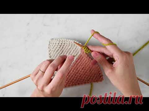 На изображении показан процесс вязания, где двое рук удерживают спицы и нитки. Руки выглядят аккуратными, одна из них держит деревянную вязальную спицу, в то время как другая придерживает пряжу светло-зеленого цвета. На спицах видно полотно, состоящее из двух треугольных частей: бежевой и коричнево-розовой. Это намекает на процесс комбинирования цветов в вязании. Фон выполнен в виде каменной или мраморной поверхности, что придаёт изображению спокойную и аккуратную атмосферу. Внизу изображения размещён логотип "postila.ru", что может указывать на источник изображения или материала.