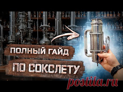 На изображении представлен промышленный аппарат с множеством клапанов и труб, занимающий большую часть заднего плана. Оборудование выполнено из металла, блестящего под искусственным освещением. На переднем плане видно человеческую руку, держащую цилиндрическое устройство из стекла и металла. Справа внизу размещён логотип "postila.ru". Фоном служит размытие сине-робкого оттенка, создающего атмосферу научного эксперимента. Также, на картинке присутствуют текстовые элементы: "ПОЛНЫЙ ГАЙД ПО СОКСЛЕТУ". Все элементы на изображении гармонично объединены, чтобы передать технологическую атмосферу. Ощущается аккуратность размещения техники и текстов, что подчеркивает образовательное и целенаправленное содержание изображения.