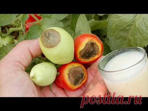 На изображении видна рука человека, держащая три томата разной степени зрелости, один из которых спелый и разрезан, демонстрируя явные признаки гнили внутри. Томаты лежат на фоне зеленых листьев. Рядом с ними находится небольшой прозрачный стакан, наполовину наполненный белой жидкостью, предположительно молоком или другим белым раствором. Листья в фоновом режиме сочные и зеленые, что указывает на свежую обстановку, возможно, в огороде или саду. Красный томат сверху имеет черное пятнышко, которое отображает начавшийся процесс гниения или болезни растения. Фотография ярко демонстрирует контраст между здоровыми плодами и пораженными, подчеркивая важность правильного ухода за растениями. Логотип "postila.ru" находится в нижнем правом углу изображения, намекая на источник или владельца изображения.