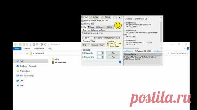 На изображении показан интерфейс программного обеспечения, отображаемого на экране компьютера. На переднем плане расположен диалог программы с различными кнопками и полями ввода, где видны такие элементы, как "TOP", "SHOW", "OPEN" и другие опции. В окне программы представлена информация о подключении ST-Link, с детализированной информацией о доступных и активных устройствах. Справа размещено еще одно окно, содержащее список доступных устройств ST-Link, а также обозначены разные уровни напряжения. Фон изображения украшен черным цветом, который плавно перетекает в белый, где видны элементы файловой системы Windows. Окно проводника показывает несколько папок и файлов, включая "OnDrive - Personal", "Яндекс.Диск" и "STFlasher.exe". Атмосфера изображения техническая и функциональная, указывающая на использование данных программ в процессах программирования или работы с микроконтроллерами.