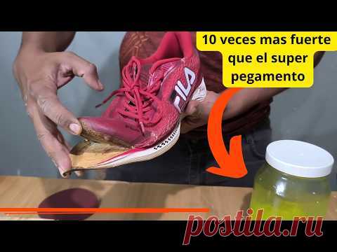 На изображении видно, как человек держит в руках кроссовок красного цвета бренда FILA. Верхняя часть обуви цела, но подошва полностью отделена и наклонена вниз. Рука сжимает кроссовок, указывая на силу действия или возможность ремонта. Справа от обуви на деревянной поверхности стоит стеклянная банка с прозрачной зеленоватой жидкостью и белой крышкой, что может быть использовано как мощный клей. На заднем плане стена светло-серого цвета. В правом верхнем углу имеется жёлтая текстовая область с надписью на испанском языке, которая заявляет о высокой силе клея по сравнению с суперклеем. Атмосфера изображения техническая и экспериментальная, показывающая демонстрацию или обзор продукта. Это может показывать способы ремонта обуви или же оценку возможностей конкретного клея.
