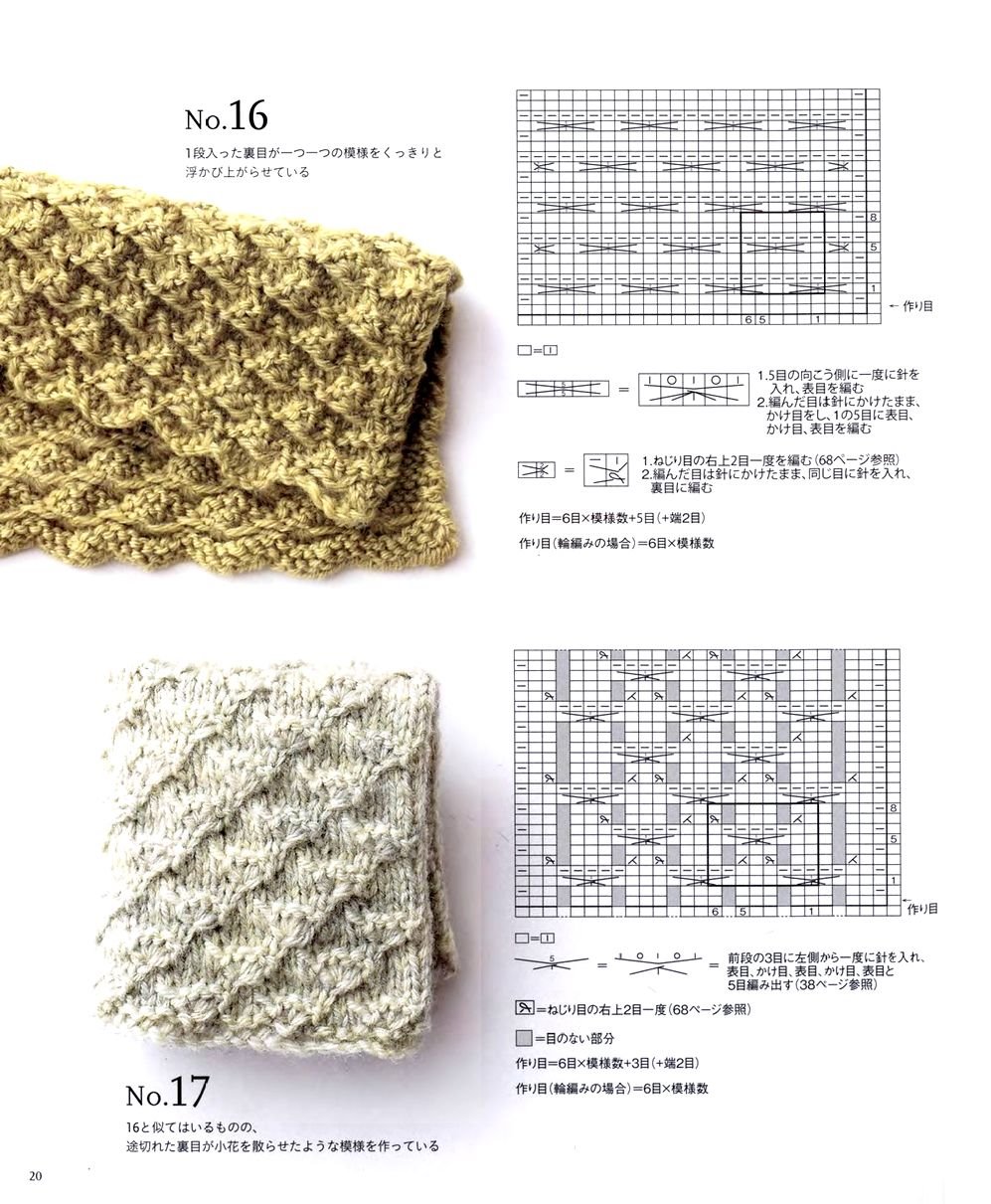 На изображении представлены две вязанные текстуры с образцами схем, обозначенные как No.16 и No.17. Образец №16 выполнен из пряжи теплого горчичного оттенка и демонстрирует сложный узор, состоящий из чередующихся текстур, создающих нежную рельефность. Рядом с ним размещена схема вязания, состоящая из ряда символов и линий, объясняющих порядок выполнения узора. Под ним находится образец №17 светло-серого цвета с похожей конструкцией, но с другой узорной формой, придающей изделию объёмный эффект. Он также сопровождается подробной схемой вязания на сетке, которая помогает воспроизвести данный узор. В правой части каждого образца находятся графические рисунки и текст на японском языке, объясняющие технику вязания. Внизу страницы указан источник как "postila.ru".