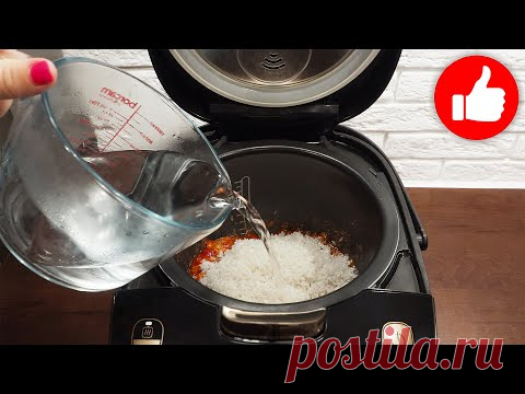 На изображении видно, как в мультиварку добавляется вода. На переднем плане рука держит прозрачный мерный стакан с красными мерными отметками, из которого в прозрачную чашу мультиварки наливают воду. В чаше видно рис и некоторые ингердиенты, возможно, специи или соусы. Корпус мультиварки имеет черный цвет с металлическими вставками и двумя кнопками управления. Верхняя крышка открыта, обнажая внутреннюю часть прибора. На заднем фоне видна белая кирпичная стена, создающая чистый и аккуратный фон. Справа в верхнем углу изображена пиктограмма с красным фоном и белым изображением поднятого большого пальца, символизирующая одобрение или лайк. В нижнем правом углу изображен логотип "postila.ru". Атмосфера изображения спокойная и уютная, с акцентом на процесс приготовления пищи с помощью современного кухонного прибора.