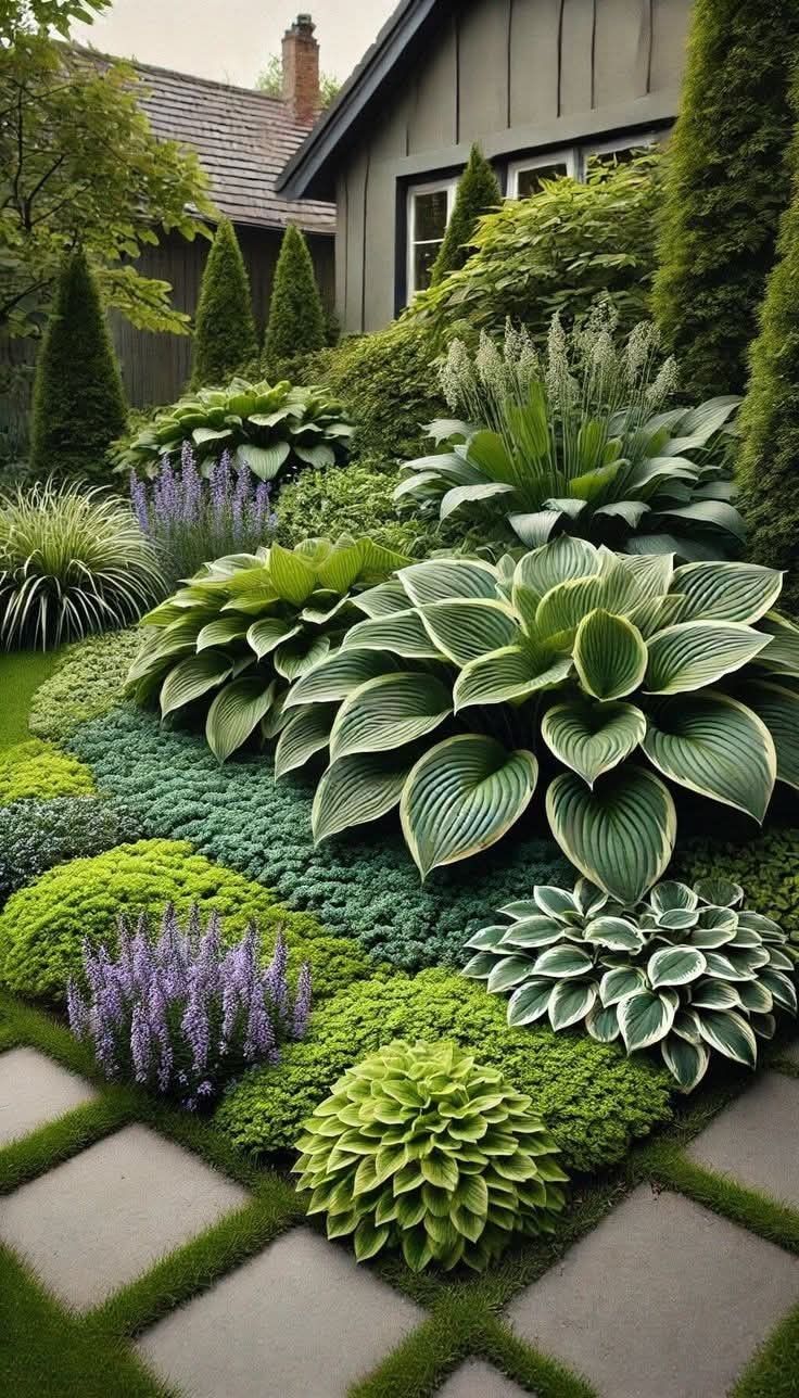 На изображении представлена ухоженная часть сада перед частным домом. В центре внимания находятся пышные растения хосты с крупными зелёными листьями, создающие гармоничный узор. Позади, вдоль стены дома, расположены туи, придающие композиции высоту и структуру. Трава яркого зелёного цвета равномерно покрывает землю, создавая плавный переход к дорожке из каменных плит. Фундамент дома отделан серым деревом, добавляя изображениям спокойную и уютную атмосферу. Сад изобилует разнообразными растениями с различными текстурами и оттенками зелёного, сред которых виднеются лаванда и кустарники, создающие яркие акценты цвета. Такое оформление придаёт саду утончённость и живописность, что характерно для профессионально спроектированных ландшафтов.