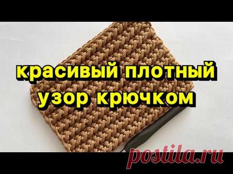 На изображении представлена вязка светло-коричневого цвета, выполненная крючком. Текстура выглядит плотной и массивной, с четко выраженными переплетениями, которые создают эффект объема. На фоне находится светлая поверхность, на которой разложен связанный образец. Картинка также содержит текст в ярко-желтом цвете с черным контуром, который гласит "красивый плотный узор крючком". Рядом с образцом лежит черный крючок для вязания, что добавляет контекста и подсказывает, что это руководство или схема для вязания. Надпись "postila.ru" указывает на источник или автора. Атмосфера изображения спокойная, подходящая для рукоделия и творчества, напоминающая о кропотливом процессе создания узоров. Вся композиция акцентирует внимание на качестве и деталях вязки, вдохновляя сохранять стремление к ручному труду.