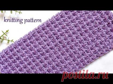На изображении представлен образец вязания спицами, выполненный в нежно-фиолетовом цвете. Он занимает центральное место на изображении, демонстрируя сложный узор, который создаёт впечатление объемного и тактильного полотна. Текстура выглядит плотной, с повторяющимися элементами, делающими его визуально привлекательным. На белом фоне, слегка видны стебли зелёных растений, которые добавляют ощущение природы и свежести. В левом верхнем углу размещён текст "knitting pattern", который гармонично дополняет состав изображения. В правом нижнем углу присутствует систематический водяной знак "postila.ru", указывающий на источник или платформу, которая может быть связана с рукоделием или декоративным творчеством. Общая атмосфера изображения создаёт ощущение уюта и вдохновения для творчества.