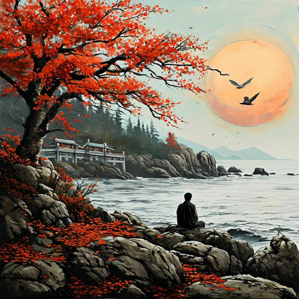На изображении представлен захватывающий пейзаж, где человек сидит на камнях у моря, погружённый в медитацию. На переднем плане расположен массивный клён с яркими алыми листьями, окружающими скалистый берег. Вдалеке виднеется традиционная японская пагода, грациозно возвышающаяся на фоне тёмных сосен и глухих холмов. На фоне большого красновато-оранжевого солнца величаво парят четыре птицы, добавляя картине элементы динамики и жизни. Вода тихо плескается о берег, создавая атмосферу спокойствия и умиротворения. Общий тон изображения сочетает в себе теплые оранжево-красные оттенки с прохладными природными тонами, создавая гармоничную и сбалансированную палитру. Этот пейзаж вызывает чувство единства с природой и внутреннего покоя.