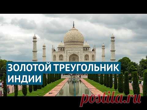 На изображении представлен знаменитый Тадж-Махал — мраморный мавзолей в Агре, Индия. Здание выполнено в изящном архитектурном стиле, сочетая элементы персидской, индийской и исламской архитектуры. Центральный купол окружен четырьмя изящными минаретами, и это сооружение отражается в протяжённом водоёме, окружённом аккуратно подстриженными кустами и симметричными садами. Небо покрыто облаками, подчеркивая белоснежную грацию сооружения. Надпись "ЗОЛОТОЙ ТРЕУГОЛЬНИК ИНДИИ" наложена поверх изображения на синем фоне, а внизу присутствует логотип "postila.ru".