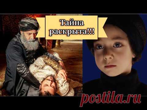 На изображении представлены две сцены, разделенные текстом "Тайна раскрыта!!!". Слева изображен мужчина с густой бородой в восточном одеянии, который сидит на полу и поддерживает голову другого мужчины, выглядящего безжизненным. Фон темный, подчеркивающий драматичность сцены, возможно в роскошных интерьерах. Справа виден ребёнок с серьёзным выражением лица и в тёмной одежде, создающим атмосферу печали. В верхней части изображение сопровождается надписью, указывающей на раскрытие тайны, связанной с казнью шехзаде Мустафы и его маленького сына. На заднем плане присутствуют традиционные восточные элементы декора и тёплое освещение.