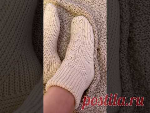 На изображении видны две ноги в теплых вязаных носках кремового или бежевого цвета, выполненных в технике вязания. На носках просматриваются красивые узоры, добавляющие текстуру и изящество. Носки слегка шероховатые, что характерно для подобных вязаных изделий. Под ногами лежит вязаный плед или покрывало аналогичного оттенка, создавая атмосферу уюта и тепла. Вся композиция вызывает ощущение комфорта и расслабления, особенно в холодное время. На заднем плане отчетливо видны детали вязки, подчёркивающие мастерство исполнения. Логотип "postila.ru" размещен в правом нижнем углу, вероятно указывая на источник фотографии.