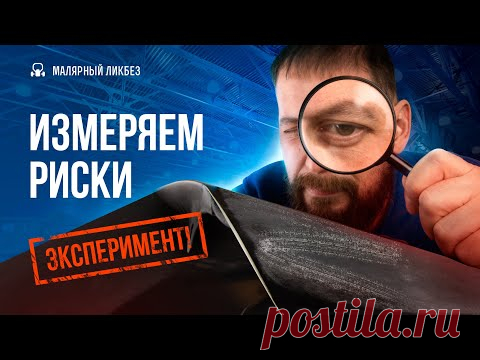 На изображении мужчина внимательно осматривает поверхность с помощью увеличительного стекла. Он одет в синюю одежду и имеет короткую прическу. На переднем плане видна деталь, которая, возможно, подвергается тестированию на выявление рисок. Надписи на изображении гласят "Измеряем риски" и "Эксперимент", что указывает на тематический контент, связанный с исследованием или проверкой изделий. Фон изображения выполнен в оттенках синего и серого, вероятно, имитирующий производственную среду с технологическими элементами. В верхнем углу размещен логотип или название проекта "Малярный ликбез". Также на изображении можно заметить элементы брендинга с веб-сайтом postila.ru.