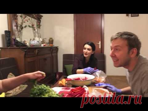 На изображении представлен интерьер комнаты, где три человека занимаются приготовлением грузинской аджики. В центре комнаты стоит стол, покрытый ингредиентами: красные перцы в тарелке и свежая зелень. Мужчина справа в светлой футболке и женщина напротив в черной одежде общаются друг с другом, на их руках надеты синие резиновые перчатки. Обстановка комнаты уютная, на заднем плане виден старинный деревянный буфет с различными декоративными элементами, которые придают интерьеру традиционную атмосферу. Дверь в комнате закрыта. Вся композиция располагает к теплому семейному обеду или дружеской встрече, посвященной кулинарии.