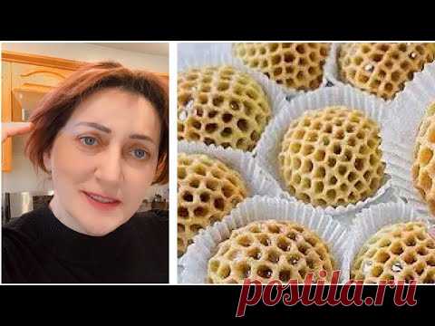 Изображение разделено на две части. Слева женщина с короткими каштановыми волосами, одета в черный свитер, улыбается. За ней видна часть кухни с деревянными шкафами. Справа крупным планом показано несколько выпеченных изделий, напоминающих соты, лежащих в белых бумажных формочках. Эти изделия имеют золотисто-коричневую окраску и пористую текстуру, похожую на сетчатую структуру. Фон белый, создающий контраст с изображениями. Атмосфера уютная и домашняя, возможно это реклама рецепта простого приготовления выпечки.