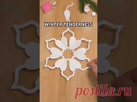 Изображение представляет собой наглядную иллюстрацию, показывающую, как вырезать снежинку из бумаги, сопровождающееся надписью "WINTER TENDERNESS". Снежинка выполнена в виде сложного симметричного узора с шестью лепестками, которые выглядят как округлые сердца, соединённые по центру. Она лежит на деревянной поверхности, создавая уютную атмосферу. В верхней части кадра можно увидеть несколько декоративных элементов — это розовый кубик и пара мелких украшений, таких как миниатюрная ёлочная ветка и маленькая рождественская фигурка. В правом нижнем углу видно руку, аккуратно держащую за уголок одной из веточек снежинки, что добавляет динамичности изображению. Всё вместе создаёт ощущение творчества и зимней подготовки к праздничному декору, демонстрируя изящество простых вещей.