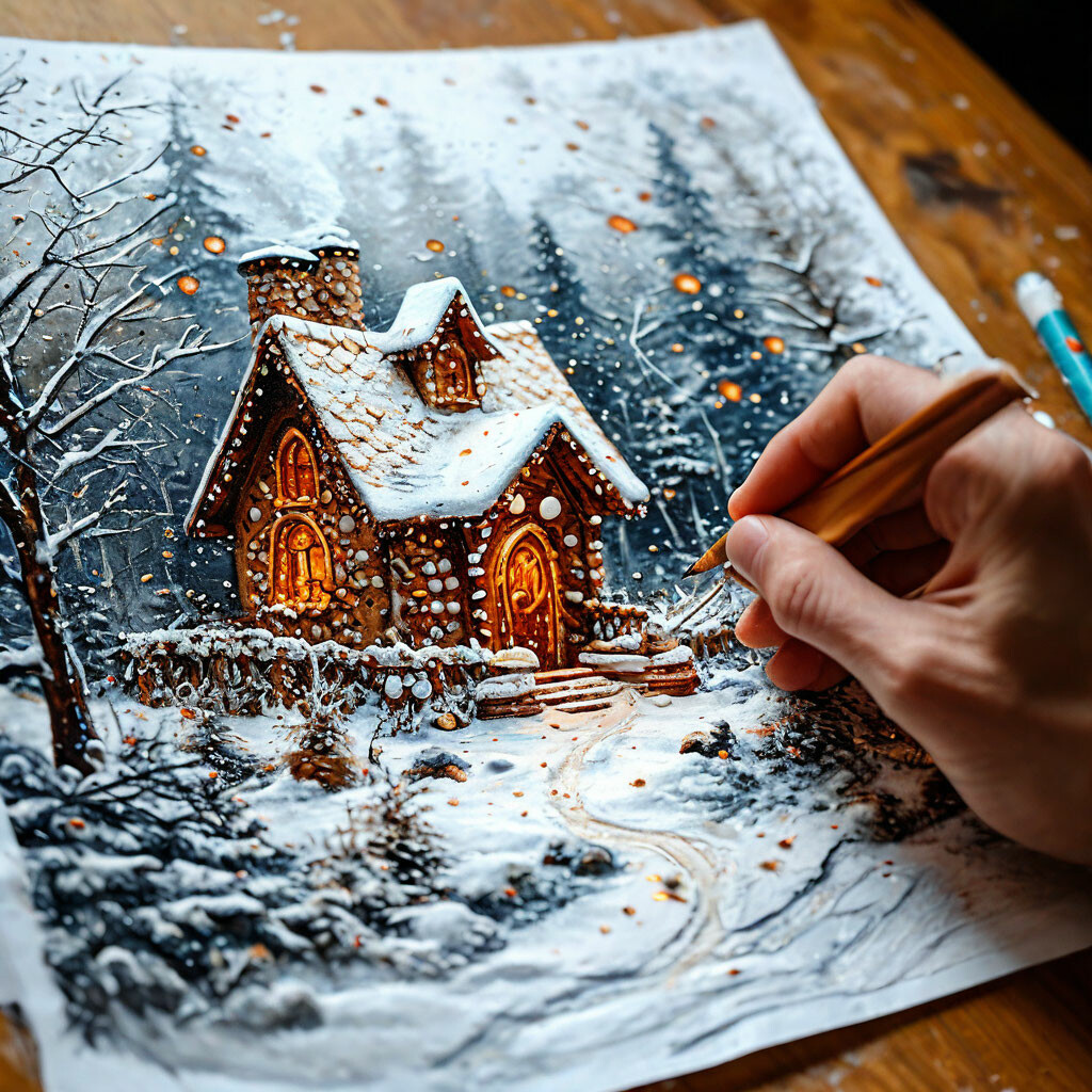 На изображении представлена сцена, в которой рука человека, держащая карандаш, завершает рисование сказочного зимнего пейзажа. Домик выполнен в стиле классического пряничного домика, с покатой крышей, покрытой снежным слоем, и каменными стенами. Окна светятся тёплым огненным светом, создавая ощущение уюта и приглашая в тепло. Вокруг домика зимний лес: деревья стоят в снегу, и на них видны тонкие, обледенелые ветви. Фон картин наполнен мягким, рассеянным светом зимнего дня, который придаёт иллюстрации спокойствие и магическое очарование. Снег плавно покрывает землю и подчёркивает извилистую дорожку, ведущую к дому. Картина выполнена аккуратно, с вниманием к мелким деталям, что добавляет реализма и живости изображению. В нижнем углу хорошо видно слово "postila.ru".