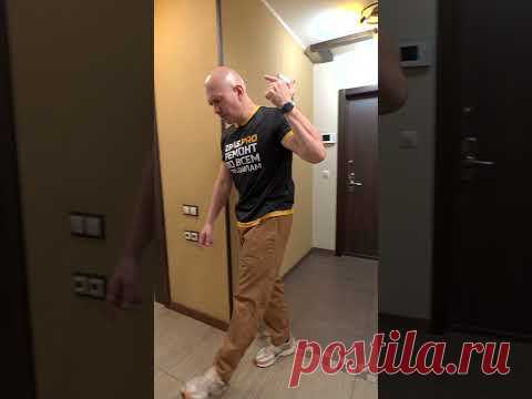 На изображении представлен мужчина в тёмной футболке с яркой надписью и коричневых брюках. Он находится в интерьере, который выполнен в тёплых тонах - видно светло-кремовую стену и дверь тёмного цвета. Мужчина, вероятно, Алексей Земсков, по наклонной позе создаёт впечатление нахождения в движении, возможно, он проходит мимо или жестом что-то объясняет. Обстановка в комнате имеет современный вид с минималистическим дизайном. На заднем плане видна дверь, ведущая в другую комнату, а также элементы интерьера, такие как выключатели и светильники на стене. Освещение мягкое, что создает теплую атмосферу.