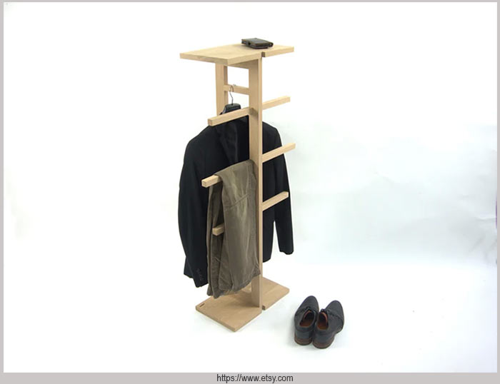 На изображении представлена мужская гардеробная, оформленная в минималистичном стиле. В центре внимания находится деревянная вертикальная вешалка геометрической формы. Вешалка выполнена из светлого дерева и имеет несколько перекладин, на одной из которых висят черное мужское пальто и светло-коричневая куртка. Над вешалкой лежит небольшой предмет, похожий на телефон или бумажник. На полу, рядом с вешалкой, расположены пара темных мужских туфель, аккуратно поставленных на белом фоне, что подчеркивает чистоту и простоту представленной композиции. Атмосфера фотографии светлая и воздушная, вся композиция выглядит организованной и эстетичной, отражая современный взгляд на минимализм в мужской гардеробной.