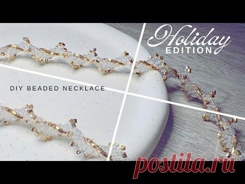 На изображении представлен изящный бисерный ожерелье, выполненное в праздничном стиле. Ожерелье состоит из множества мелких прозрачных и золотистых бисерин, создающих эффектный узор. Оно размещено на светлом фоне, возможно, светло-серого или белого цвета, что подчеркивает его сияние и утонченность. В верхнем правом углу можно заметить надпись "Holiday Edition", выполненную изящным шрифтом, что подчеркивает тематичность изделия — оно предназначено для особых случаев, таких как праздничные мероприятия или торжества. Также на изображении присутствует текст "DIY BEADED NECKLACE", что свидетельствует о том, что это руководство или учебный материал по созданию ожерелья своими руками. В нижнем правом углу видно логотип или название интернет-ресурса "postila.ru", который, вероятно, является платформой для публикации подобных творческих материалов.