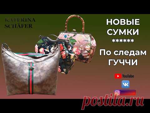 На изображении представлены три сумки с различным дизайном на фоне градиента от тёмно-зелёного к тёмно-коричневому. В центре находится сумка с цветочным принтом, где преобладают розовые и зелёные оттенки, а у неё сверху изогнутая ручка в стиле ретро. Слева видна сумка более нейтрального серого цвета с декоративной полосой в виде ленты в красно-зелёных тонах, подчеркивающей её элегантный и современный стиль. За первой сумкой можно увидеть ещё одну с темным цветочным узором, где преобладают сочные красные и зелёные оттенки. Сверху на картинке написано «Katerina Schäfer», что может быть связано с брендом или дизайнером представленных моделей. Справа текст «НОВЫЕ СУМКИ ПО СЛЕДАМ ГУЧЧИ» сигнализирует о том, что данные сумки стилизованы следуя трендам известного бренда Gucci. Под текстом изображены логотипы YouTube, VK, Instagram, что указывает на присутствие данных продуктов или бренда в этих социальных сетях.