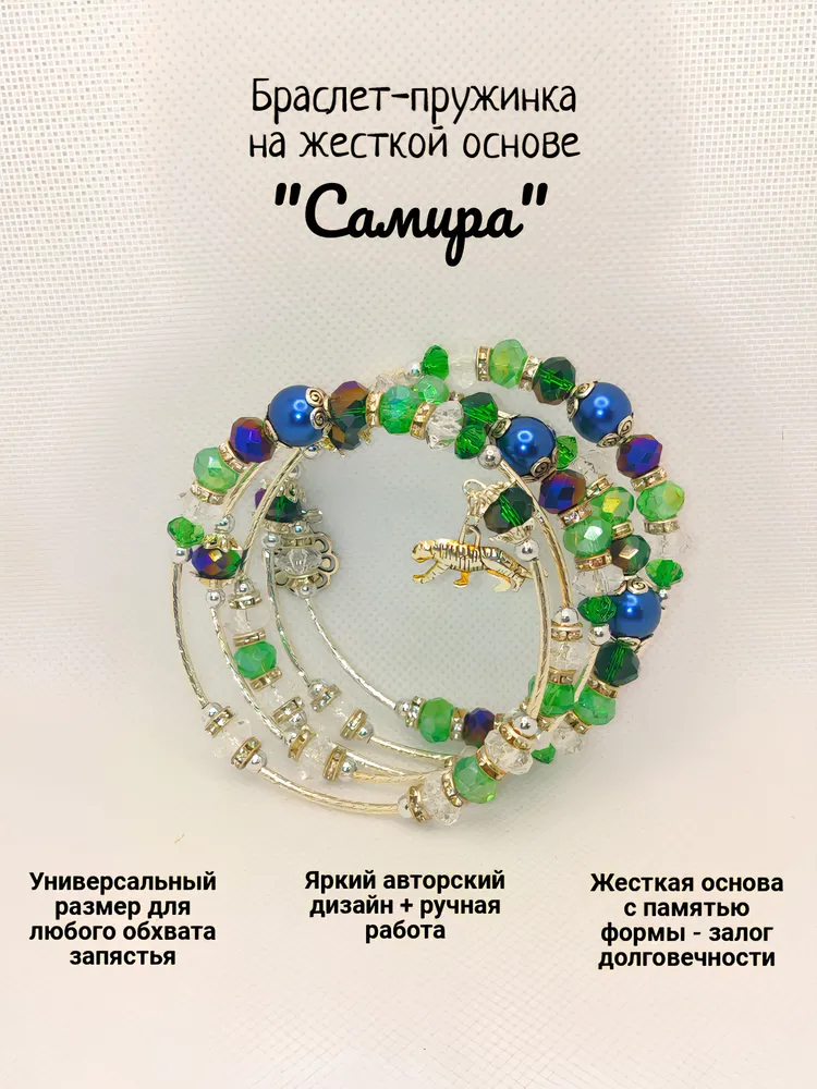 На изображении представлен женский браслет, выполненный на жесткой основе в виде пружинки и именуемый "Самира". Это изделие отличается ярким авторским дизайном и ручной работой. Браслет украшен разноцветными бусинами, включая синие, зеленые и прозрачные элементы, что придает изделию необычный внешний вид. Некоторые из бусин инкрустированы металлическими вставками. Центральная часть браслета украшена изящной подвеской в виде животного, придающей изделию оригинальность. Браслет сделан на мемори-проволоке, которая позволяет ему сохранять форму и идеально садиться на любое запястье благодаря универсальному размеру. На белом фоне вокруг браслета размещены рекламные надписи о его достоинствах. Он представлен как продукт, который можно приобрести на платформе OZON по выгодной цене.