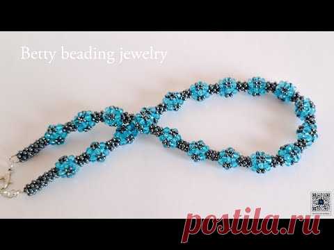На изображении представлено изделие из бисера, которое украшает белый фон. Это браслет или ожерелье, выполненное из голубого и черного бисера, аккуратно сплетенного в виде цветочных узоров. Голубые бисеринки образуют цветочные структуры, окруженные более темными бисеринами. Изделие имеет декоративный и изящный вид, демонстрируя мастерство и аккуратность в деталях. На фоне изображена надпись "Betty beading jewelry", что указывает на возможно брендовое исполнение изделия. Также на картинке виден логотип "postila.ru". Это удачное сочетание цветов привлекает внимание своим контрастом и сложной техникой плетения. Изделие может использоваться как часть набора.