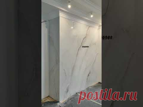 На изображении представлено современное интерьерное решение с использованием искусственного мрамора для отделки стен. Стена окрашена в светло-серый тон с характерными прожилками, которые придают поверхности элегантный и утонченный вид. На стене видны несколько черных розеток, расположенных в ряд, что добавляет функциональности пространству. Потолок обрамлен белыми карнизами с встроенным освещением, создающим мягкий и уютный эффект, делая комнату светлее и просторнее. Пол, покрытый защитной пленкой, указывает на то, что ремонтные работы еще не завершены. Светильники равномерно распределяют свет по комнате, подчеркивая гладкость и блеск поверхности стены. Внедрение таких материалов акцентирует внимание на стильную простоту интерьера. В целом, изображение передает атмосферу минимализма и современного дизайна.