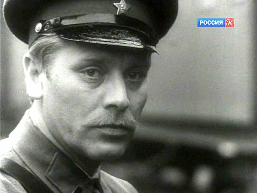 Черно-белая фотография изображает мужчину, одетого в военную форму с фуражкой. На фуражке видна звезда, символизирующая принадлежность к вооруженным силам. Фигура повернута немного на 3/4 влево, взгляд серьезный и сосредоточенный. На фоне нечетко виднеются очертания каких-то построек, возможно, в городской или промышленной зоне. Освещение мягкое, но контрастное, что придает фотографии выразительность и драматизм. На изображении - Алексей Эйбоженко, актер, чьи годы жизни с 6 февраля 1934 года по 26 декабря 1980 года совпадают с надписью рядом с фото. В верхнем углу виден логотип телеканала "Россия", что может свидетельствовать о кинематографическом или историческом контексте снимка.