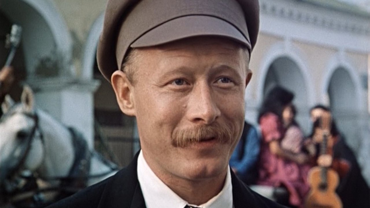 На изображении изображен мужчина среднего возраста с короткими светлыми волосами и аккуратными усами. Он одет в темный костюм с белой рубашкой и шляпу с козырьком нейтрального цвета. Фон иллюстрирует сцены жизни с несколькими людьми одетыми в яркие костюмы традиционного стиля, возможно, связанные с исторической эпохой России. Можно рассмотреть конную повозку и архитектурные элементы типичные для старинных зданий с арками. Атмосфера изображения передает дух прошлых веков с нотками ностальгии и романтики. Кадр создает впечатление художественного или кинематографического проекта с тщательно подобранными деталями и композицией.