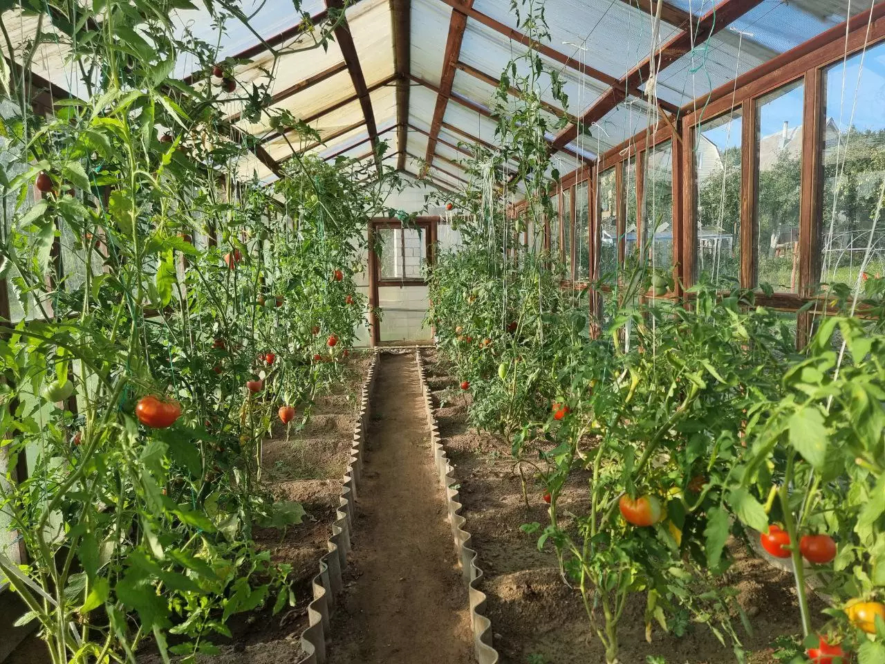 На изображении представлена теплица с высоким деревянным каркасом и прозрачными стеклянными стенами. Внутри теплицы растут томаты, подвязанные к конструкциям сверху. Солнечный свет проникает через стекла, создавая яркое и теплое освещение. Томаты выглядят зрелыми; они насыщенного красного цвета, что добавляет яркости всей структуре. По центру теплицы проходит узкая земляная дорожка, окруженная рядами томатов. Теплица окружена природой, что видно сквозь прозрачные стены. Атмосфера теплицы спокойная и продуктивная, создающая ощущение уюта и гармонии с природой. Овалы листвы идут вдоль рядов, создавая густую зелень, которая контрастирует с лейтмотивом прозрачных стен и крыши, пропускающих обильный свет. Такой тип теплицы идеален для круглогодичного выращивания овощей.