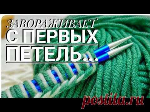 На изображении крупным планом изображены вязальные спицы синего цвета и зелёная пряжа, которая образует узор. Спицы и пряжа лежат на фоне множества сложенных нитей, создавая впечатление недавнего начала вязания. Толстые нити насыщенного зелёного оттенка переплетаются между собой, как бы показывая первые шаги в создании текстильного произведения. На картинке также видно текст на русском языке: "Завораживает с первых петель..." и логотип сайта postila.ru. Атмосфера изображения воплощает в себе вдохновение и заряд для творчества, пробуждая желание начать вязать что-то новое и необычное. Текст акцентирует внимание на простоте и увлекательности процесса создания, подчёркивая удовольствие от хобби и творческого самовыражения.