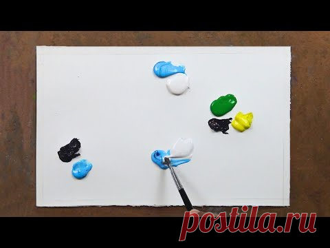 На изображении представлена палитра с яркими акриловыми красками на белом фоне. В центре виден небольшой участок, где кисть аккуратно смешивает голубую и белую краски, создавая новый оттенок. Вокруг расположены пятна других цветов, включая черный, зеленый и желтый, приковывая взгляд своей насыщенностью и контрастом. Чёрная и голубая краски расположены внизу, в то время как белая, зеленая и жёлтая краски занимают верхнюю часть холста. Кисть, которой сдержанно перемешиваются цвета, имеет чёрную рукоятку и тонкий, аккуратный ворс, что делает её подходящей для детальной работы. Палитра находится на коричневом фоне, подчёркивающем яркость красок и создающем тёплую, рабочую атмосферу, вдохновляющую на творчество. Это изображение связано с созданием пейзажей, акцентируя внимание на простоте и доступности техники рисования.