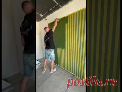 На изображении показан процесс декорирования стены в интерьере. Мужчина в черной футболке и джинсовых шортах наносит зеленую краску на стену, которая украшена вертикальными желто-зелеными полосками. Пол бетонный, без отделки, а потолок белый, частично покрытый черным лаком или пластиком. Этот творческий процесс выглядит современно и, возможно, является частью проекта "сделай сам". Вместе с динамичным жестом, художник вдохновенно работает над визуальной трансформацией помещения, играя на контрасте цветов и геометрии. Атмосфера напоминает стильные дизайнерские интерьеры, ориентированные на оригинальность и индивидуальность.