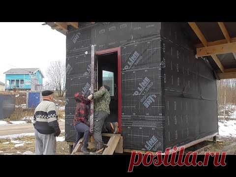 Установка двери. Высушивание каркаса. Утепление. Мастерская с навесом для двух машин.
