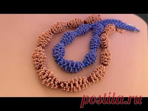 На изображении представлены два плетеных ожерелья, выполненные вручную в технике бисерного плетения. Одно из ожерелий изготовлено из светло-розовых бусин, формирующих сложный узор. Второе ожерелье выполнено в насыщенном синем цвете, что контрастирует с первым. Каждое ожерелье имеет волнообразный дизайн, создавая ощущение текстуры и глубины. Эти ожерелья лежат на мягкой пастельной поверхности, предположительно столе, что добавляет теплоты и мягкости общему ощущению от фотографии. Размещение ожерелий рядом подчеркивает их уникальность и мастерство выполнения, привлекая внимание к деталям и аккуратности плетения. Эстетика изображена просто и изящно, подчеркивая времязатратный процесс создания каждого изделия. В правом нижнем углу можно заметить надпись "postila.ru", что может свидетельствовать об источнике изображения.