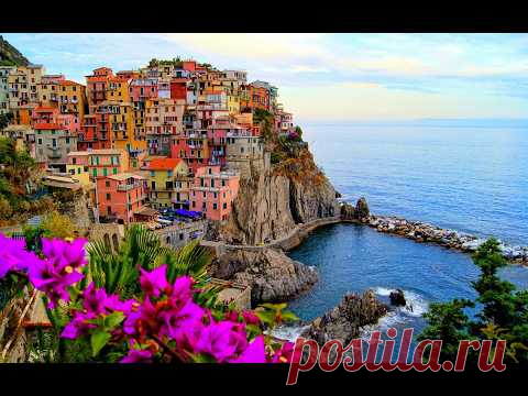 На изображении изображен живописный вид на деревню Манарола, одну из известных деревень региона Чинкве-Терре в Италии. Яркие разноцветные дома, возведенные на склонах скалистого утеса, создают удивительный эффект контраста с лазурным морем. Живописные здания доминируют на фоне, их цвета варьируются от желтого и оранжевого до розового и красного. Внизу под утесом виднеется небольшая бухта с спокойной водой, окруженной каменными стенами, которые защищают деревню от суровых морских волн. На переднем плане можно заметить яркие цветущие растения, добавляющие еще один слой цвета и жизни в эту уединенную и чарующую местность. Это место говорит о гармонии между природой и архитектурой, где каждый элемент дополняет другой, создавая единую картину мира.