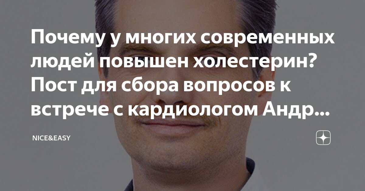 Почему у многих современных людей повышен холестерин? Пост для сбора вопросов к встрече с кардиологом Андреевым А. Я. Статья автора «Nice&Easy» в Дзене ✍: Всем привет! Ох уж этот Хороший, Плохой, Злой... Холестерин! Сколько тумана, мифов и суеверий роится вокруг него. Просили авторитетное мнение кардиолога?