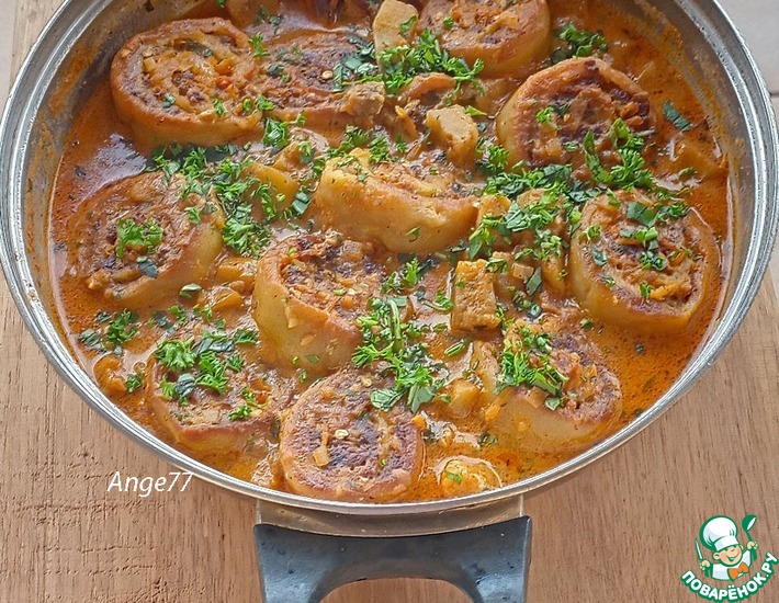 - В мясной фарш (говядина + свинина) добавить измельченный лук, чеснок, смесь перцев, соль, мелкорубленную зелень по вкусу, все тщательно перемешать. Я ещё добавляю в фарш чайную ложку дижонской горчицы. Пельменное тесто раскатать на припыленной мукой рабочей поверхности квадратом, примерно 25х25 см (я делаю заварное тесто для пельменей). Распределить фарш на тесте тонким слоем, не доходя до краев, морковь по- корейски сверху (морковку делаю сама). Край, к которому будем сворачивать рулет, должен быть более свободный от начинки, чтобы тесто хорошо закрепить. Плотно свернуть в рулет, разрезать на роллы толщиной около 2 см. Роллы слегка придавить ладонью и обжарить с двух сторон на сковороде с антипригарным покрытием до румяной корочки, добавив немного масла или без него. Такую заготовку можно хранить в морозилке до нужного момента. Из указанного количества фарша у меня выходит 3 рулета и примерно 33 ленивых пельменей. Приготовить продукты для соуса. Лук нарезать мелко, баклажан довольно крупными кубиками (срезать кожицу или нет, на ваше усмотрение), помидоры пробить в блендере. В широком сотейнике или глубокой сковороде разогреть 4 ст. л. масла, добавить лук, жарить пару минут на среднем огне, Также к луку я добавляю стручок острого перца, разрезанного пополам, это для любителей остренького (потом перец из соуса убираю). Добавить смесь черного и белого перцев, кумин, помешиваем минутку, затем баклажаны и помидоры, увеличить огонь. Жарить, помешивая, пока из помидор не выйдет излишек жидкости. Нам нужно, чтобы помидоры поджарились, так у соуса не будет кисловатого вкуса. Добавить соль, чеснок, пропущенный через пресс, сметану, перемешать, влить 1,5 стакана воды, довести до кипения, скорректировать на соль. Уменьшить огонь, выложить ленивые пельмени не плотно в один слой, тушить под крышкой до готовности (примерно 20 минут). Иногда помешивать соус, аккуратно переворачивая пельмени. По мере необходимости, или в зависимости от желаемой густоты соуса, добавить воды.