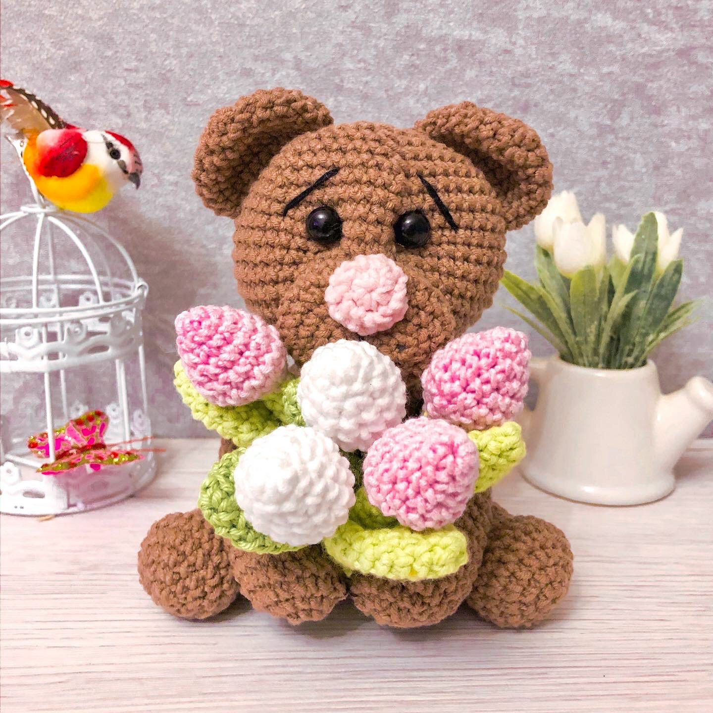 PDF Мишка с тюльпанами крючком. FREE crochet pattern; Аmigurumi animal patterns. Амигуруми схемы и описания на русском. Вязаные игрушки и поделки своими руками #amimore - медведь, медвежонок, мишка.