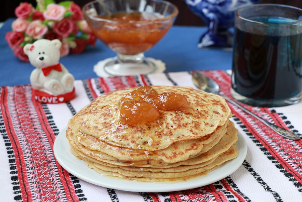 - Подаём блинчики из овсяной муки, замешанные на молоке, к чаю, дополнив вареньем или мёдом.