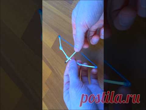 На изображении показаны две человеческие руки, которые создают самодельный лук и стрелу, используя спички и резинку. Цвета преобладают естественные, с теплыми оттенками древесно-коричневого цвета пола на заднем плане. Руки сосредоточены на переднем плане, выделяясь на фоне ярким освещением. Спички белые с синими головками. Возможно, резинка также синего цвета, создающая контраст с деревянным полом. Жесты рук аккуратные, и видно, что процесс требует внимательности и точности. Композиция изображения вертикальная, с фокусом на процессе создания, подчеркивающая тонкую работу. На заднем фоне видна текстура деревянного паркета, которая создает теплую и уютную атмосферу. Свет мягкий, без резких теней, создающий спокойное и сосредоточенное настроение. Внизу справа расплывчатый текст.