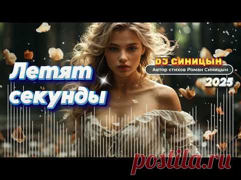 На изображении изображена девушка с длинными светлыми волосами, одетая в лёгкое платье с открытыми плечами. Впереди неё падают белые лепестки, создавая романтичную и мечтательную атмосферу. На заднем плане видно размытие, что создаёт эффект глубины и фокусирует внимание на женском образе. Девушка смотрит прямо в камеру, в её выражении лица присутствует легкая задумчивость. Фон насыщен зелёными и темными оттенками, что подчеркивает светлую фигуру на переднем плане. Надпись "Летят секунды" выполнена в жирном бело-синем шрифте с эффектом объёма и воспламеняющимся контуром, что добавляет динамики изображению и подчеркивает музыкальную тематику. Справа находится текст "DJ СИНИЦЫН - Автор стихов Роман Синицын 2025", который придаёт личный акцент и обозначает принадлежность работ. Свет и тени распределены так, что создают контрастирование, подчёркивающее выразительность и эмоции сцены.