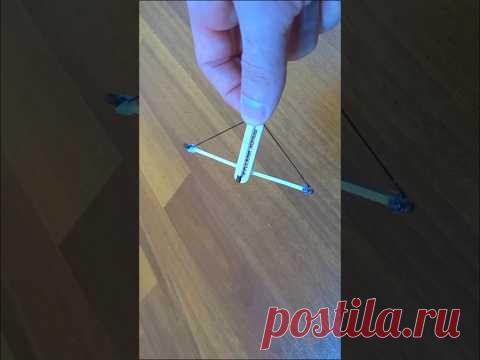 На изображении запечатлена рука, держащая миниатюрное изделие, напоминающее арбалет. Рука имеет светлый тон кожи и слегка согнута, удерживая арбалет за середину корпуса. Арбалет выполнен из натуральных и доступных материалов — его составляют окрашенные в светлые тона деревянные палочки и натянутая черная резинка, вероятно, резинка от канцелярской скрепки. Это минималистичный и креативный объект, представленный на фоне деревянной поверхности напольного покрытия, что придаёт изображению рустикальный и уютный вид. Светло-коричневый цвет пола контрастирует с более светлыми элементами арбалета и создает впечатление теплого и приглушенного освещения. Композиция сосредоточена на руке и арбалете, оставляя мало свободного пространства вокруг, что создает эффект близкой перспективы и вовлеченности наблюдателя в процесс. Этот интересный и необычный мини-арбалет можно рассматривать как проявление креативного рукоделия и инженерной смекалки, вдохновленной средневековым оружием и научными экспериментами.