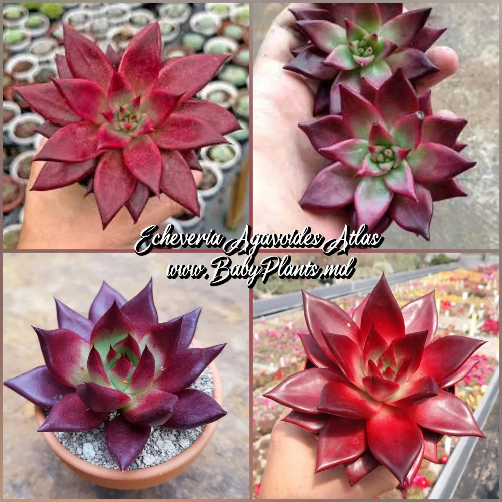 Изображение представляет собой коллаж из четырех фотографий суккулента Эхеверия Агавоиды Атлас. На первом снимке в верхнем левом углу показано растение с насыщенными темно-красными листьями, держащееся в руке. Видны текстура и симметричная структура розетки. На верхнем правом снимке две небольшие эхеверии показаны на ладони, их листья насыщенного бордового оттенка с зеленым центром. На фотографии в нижнем левом углу эхеверия расположена в терракотовом горшке на фоне землистого покрытия, создающего простой и естественный контраст. На нижнем правом снимке растение выглядит ярким, с блестящими и глянцевыми красными листьями на фоне размытой посадки других суккулентов. В центре изображения присутствует надпись "Купить Эхеверия Atlas по цене 98 MDL от производителя", подчеркивающая возможность приобретения этого растения. Общая композиция передает ощущение натуральной красоты и гармонии, свойственной суккулентам.