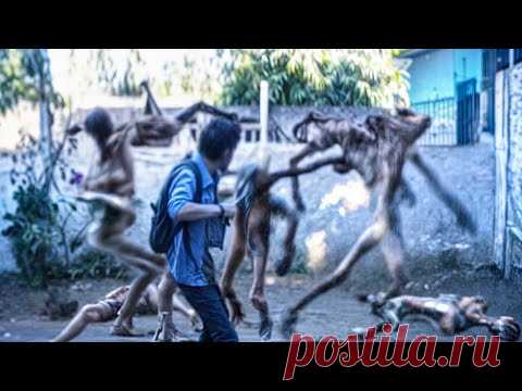 На изображении запечатлен момент, который кажется сюрреалистичным и фантастическим. В центре находится человек с рюкзаком, одетый в голубую рубашку. Он быстро движется вперед, как будто пытается избежать преследования. Перед ним и позади него видны фигуры, напоминающие мифических существ или демонов с длинными конечностями. Их движения запечатлены в размытом виде, создавая эффект движения и спешки. Эти существа наводят атмосферу ужаса и тревоги из-за своей неестественной формы и активных, динамичных поз. Сцена происходит на улице, возможно, в жилом районе, так как на заднем плане видна стена и участок зелени. Освещение яркое, что придает сцене дневной вид. Настроение изображения напряженное и захватывающее, как будто оно взято из фантастической истории или видеоигры с элементами экшена. Фраза "Если бы эти безумные встречи не были сняты, никто бы не поверил!" удачно подчеркивает невероятность события.