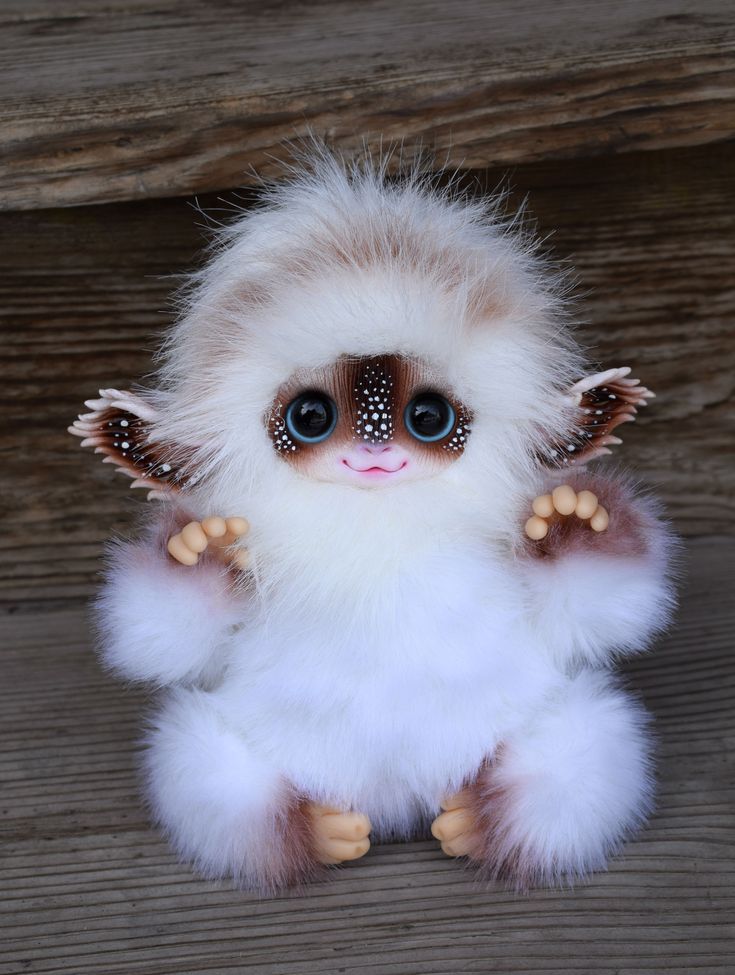 На изображении представлен очаровательный плюшевый персонаж, обладающий крупными выразительными глазами и мягкой белой шерстью. Его уши украшены точечным узором, придающим экзотический вид. Центральный элемент лица — розовая улыбка, создающая дружелюбное впечатление. Руки и ноги выполнены в нежном бежевом цвете, символизируя конечности. Позади игрушки находится деревянная текстурированная поверхность, которая служит фоном и создает контраст с белоснежной шерсткой. Тёплые коричневые и розовые оттенки добавляют уют и придают игрушке особую изысканность. Композиция изображения акцентирует внимание на центральной фигуре, оставляя фон нейтральным. Свет равномерно распределен, исключая резкие тени и подчеркивая текстурные детали. В контексте фотографии ощущается легкость и радостное настроение.